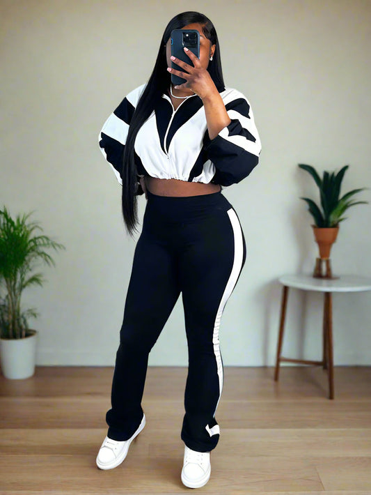 Sporty Contrast Top & Flared Pants Set