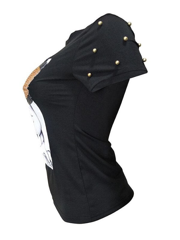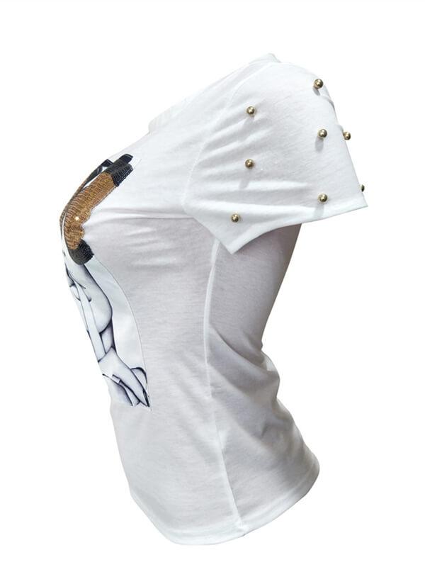 - Golden Sequin Glass, Face Printed, Round Neck, Pearl Studded Short Sleeve