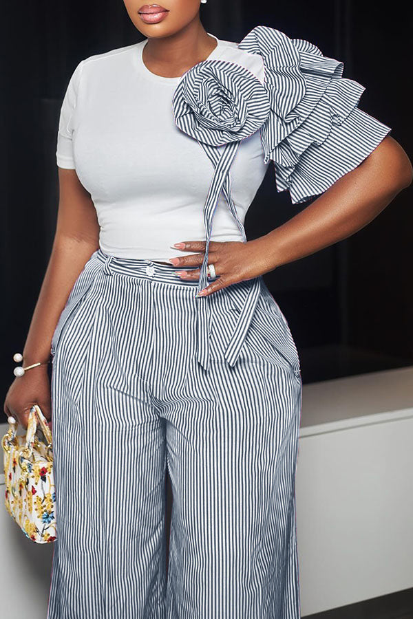 Single Ruffle Sleeve T-Shirt and Striped Pants Set
