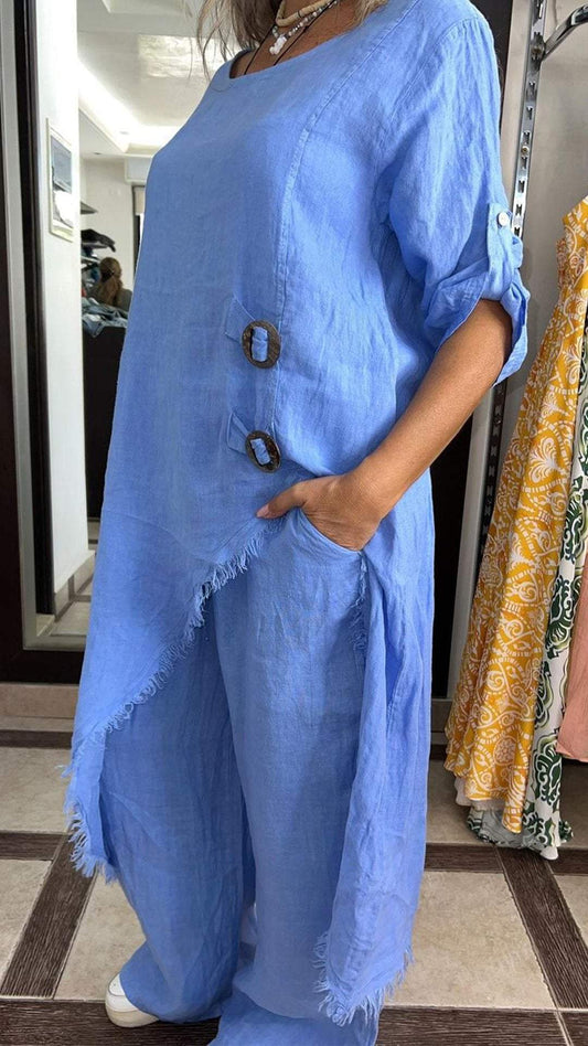 Conjunto feminino de duas peças de algodão e linho de cor sólida