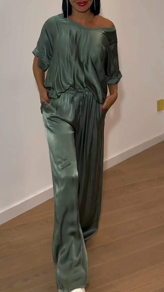 Top feminino de cetim liso com meia manga e calça de duas peças
