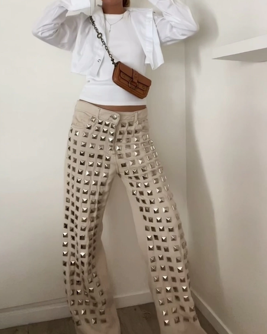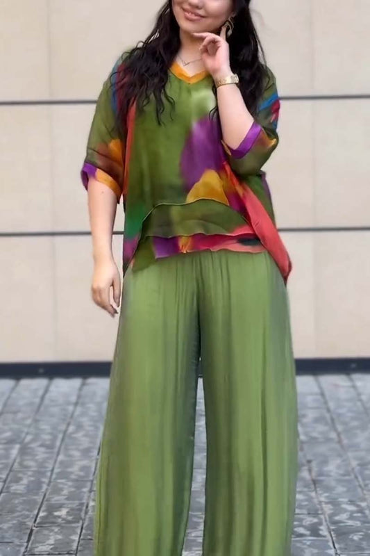 Conjunto elegante de duas peças com blusa e calças estampadas em chiffon
