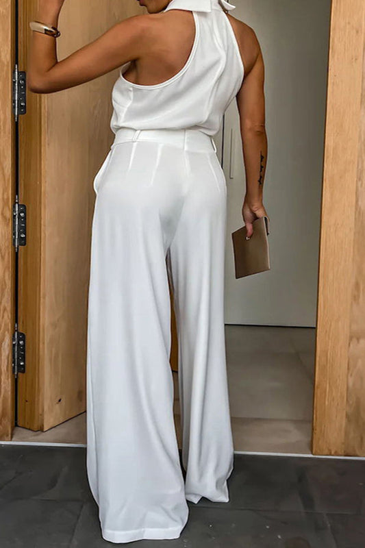 Macacão elegante com gola halter, cor sólida e pernas largas