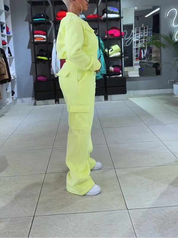 - Zip Front, Long Sleeves, Elastic Waist, Cargo Pants